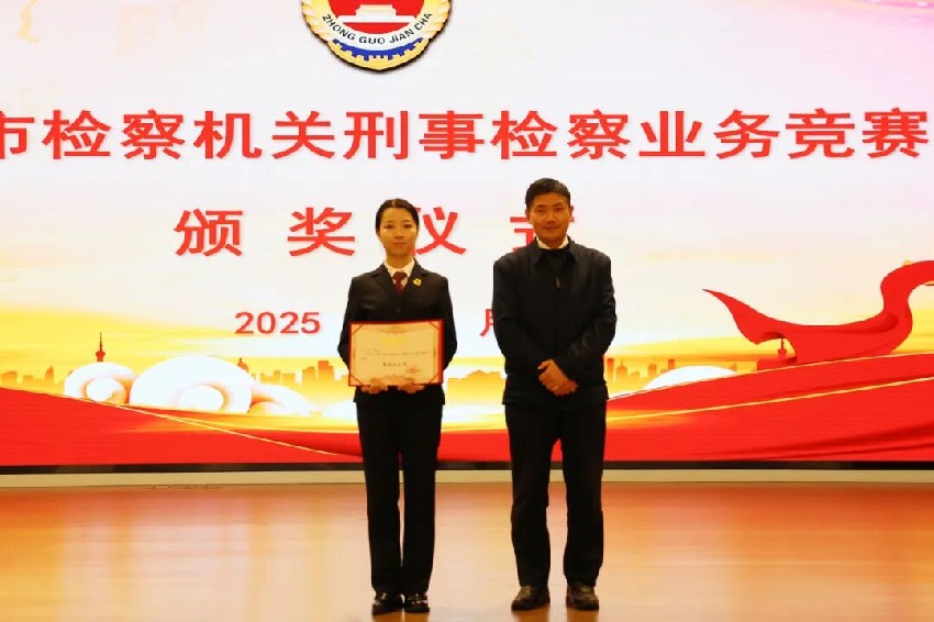 (图为湖北省检察院第一检察部四级高级检察官邱炜,十堰市检察院党组成员、副检察长晏改会为业务能手颁奖)